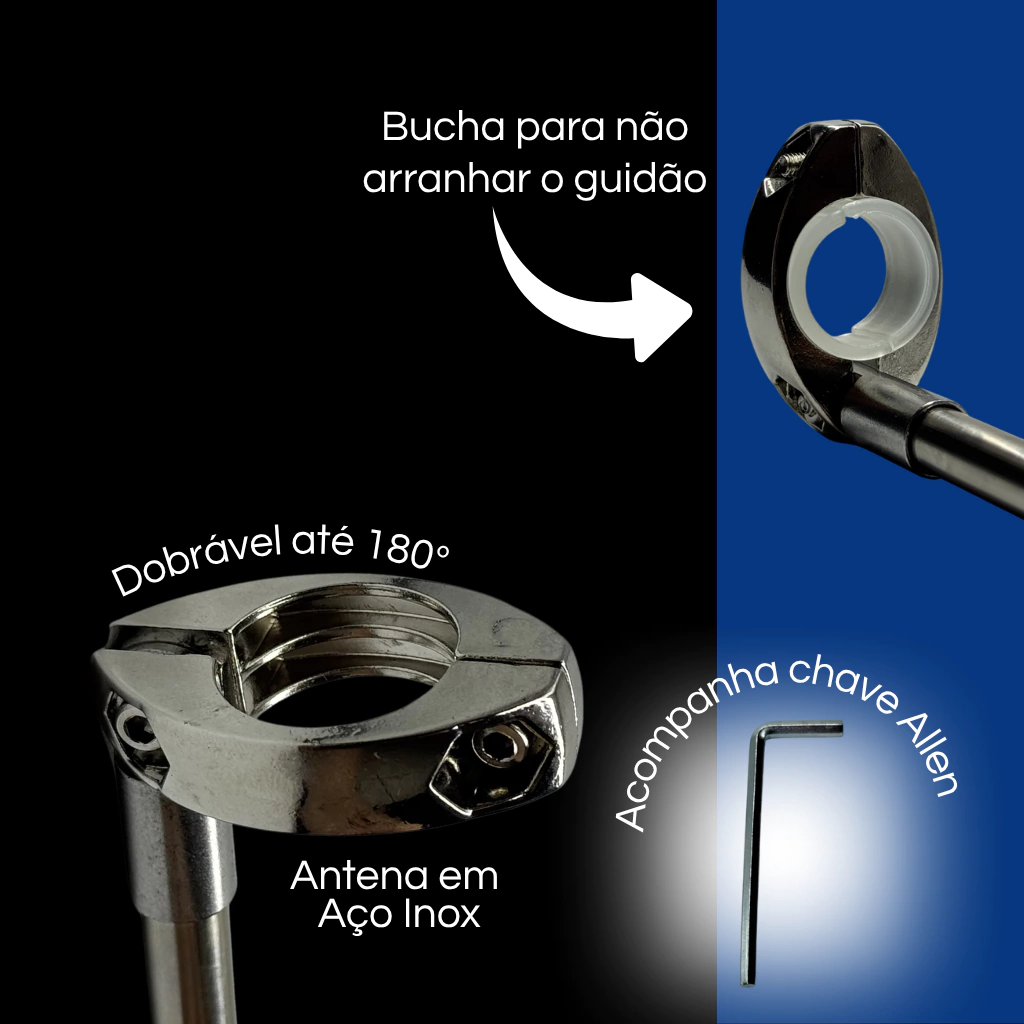 Fabricada em aço inox de alta resistência, a antena corta pipa oferece durabilidade superior e ainda deixa sua moto com um design esportivo e moderno. Seu sistema retrátil é prático e se adapta facilmente ao guidão ou retrovisor, podendo ser instalada em motos, quadriciclos e até bicicletas.