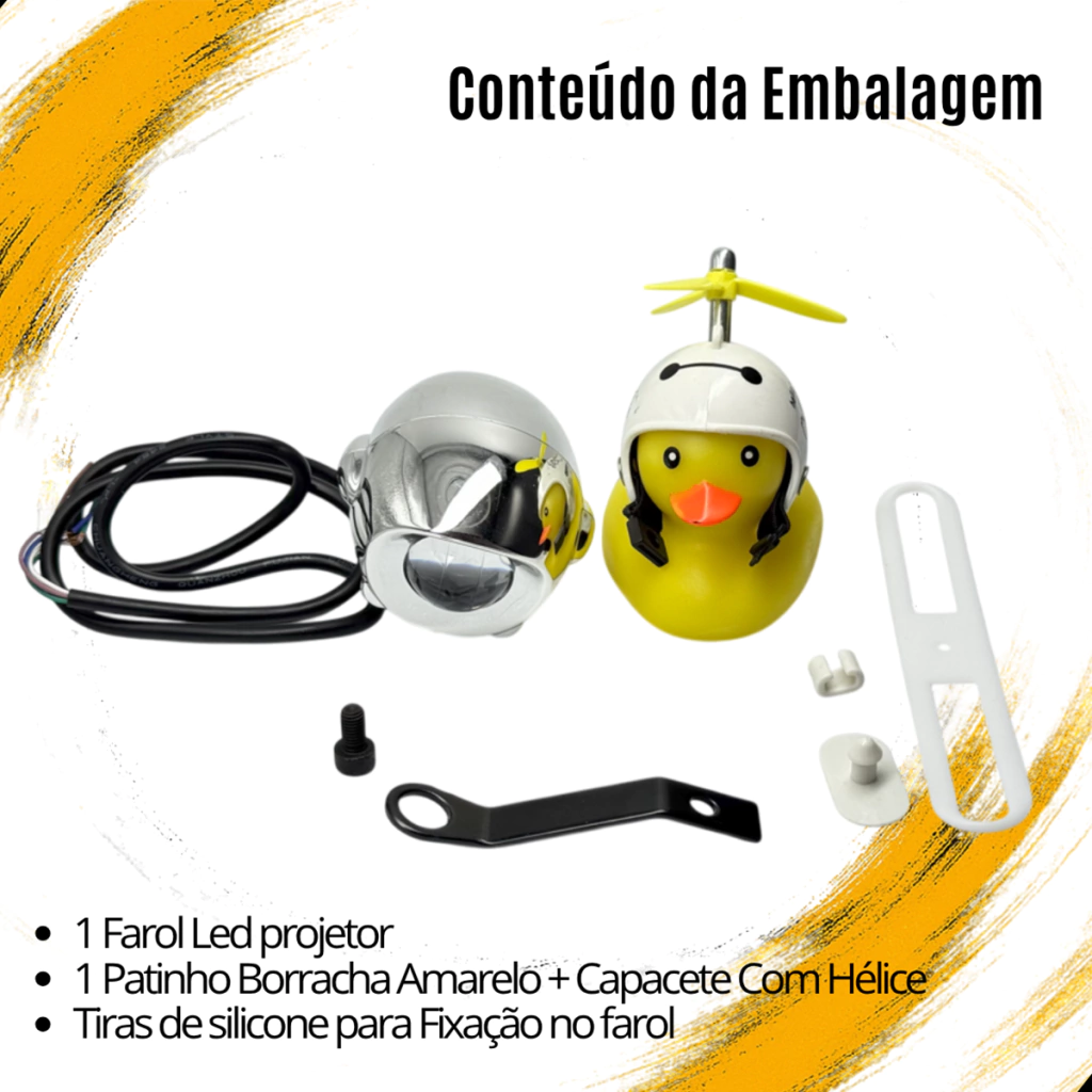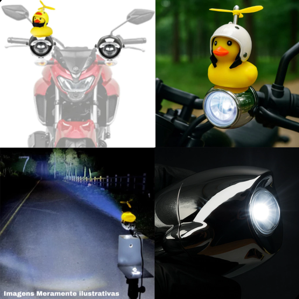 Este farol de moto conta com LED de alto brilho, três modos de iluminação e design exclusivo com patinho motoqueiro usando capacete e hélice giratória. Ele garante excelente desempenho e se adapta a diferentes necessidades: