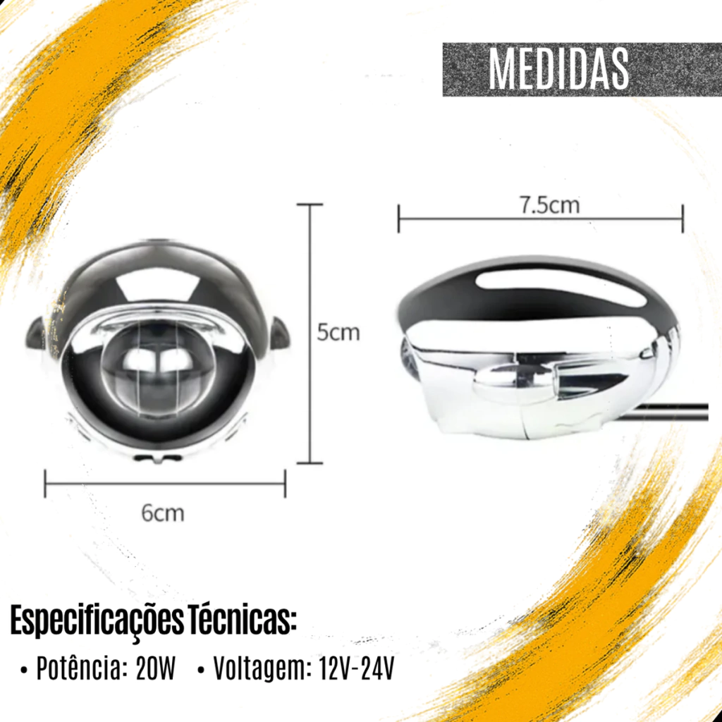 O Farol de Led para Moto possui potência de 20W, funciona em 12V e 24V, conta com proteção IP67 contra água e poeira e oferece durabilidade mesmo em uso intenso. Além de melhorar a iluminação da moto, ele adiciona um toque criativo que vai chamar atenção por onde você passar.