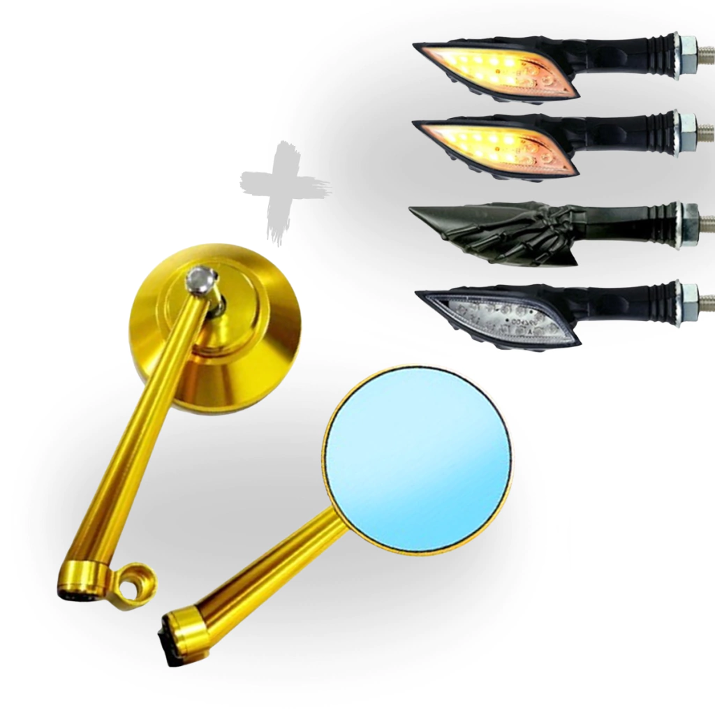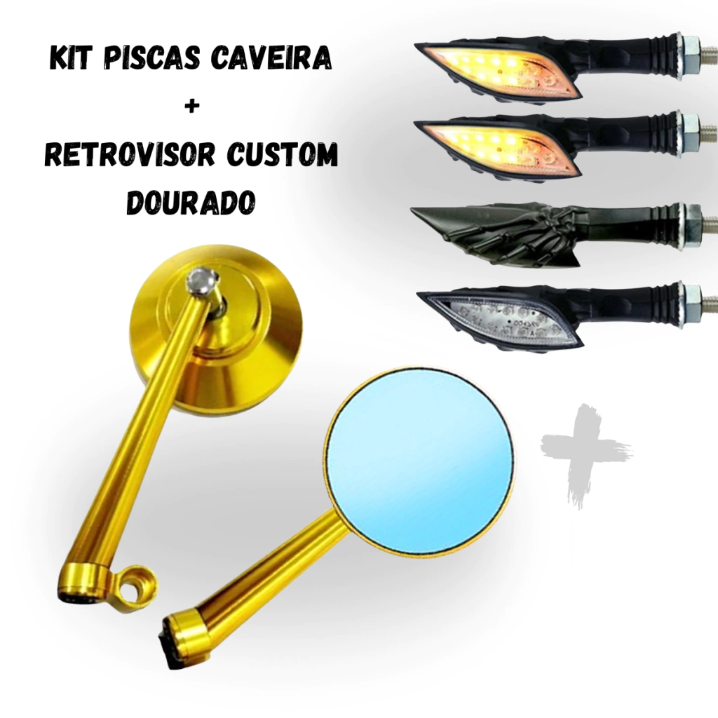 ?Garanta agora o Kit 2 Pares de Piscas Caveira Preta + Retrovisor Custom Dourado e transforme sua moto com um toque de atitude e estilo.