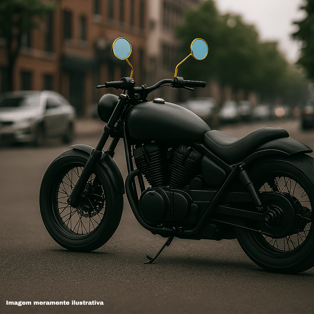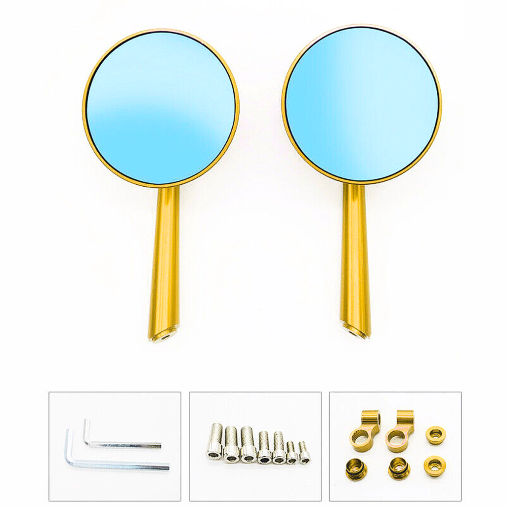 1 par de retrovisores Custom Dourados, feitos em alumínio de alta durabilidade, com haste retrátil e espelho redondo, garantindo visibilidade perfeita e visual moderno.