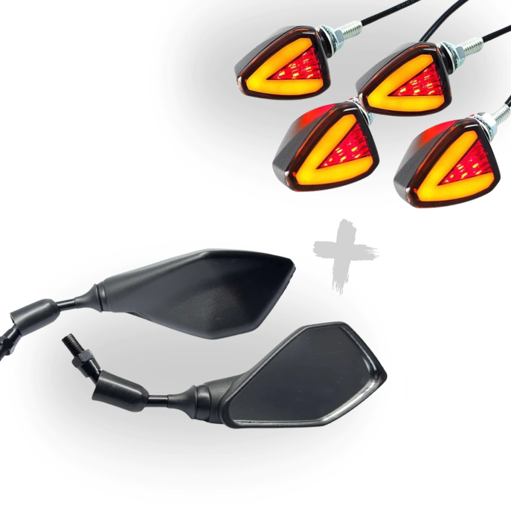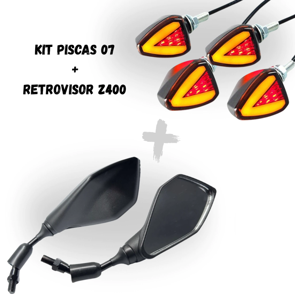 O conjunto combina o Retrovisor Z400 estilo Yamaha com 2 pares de piscas P07 em LED de alto brilho, garantindo presença, visibilidade e durabilidade em qualquer trajeto.