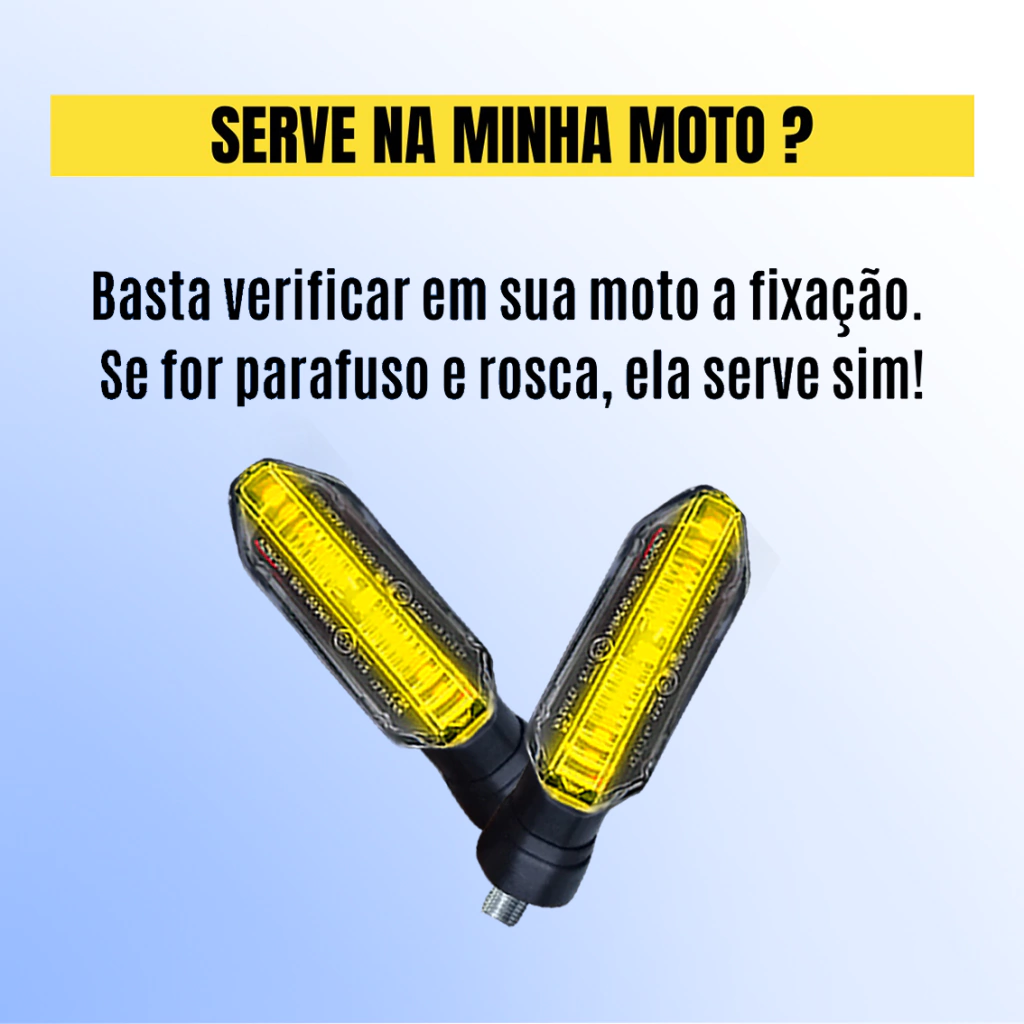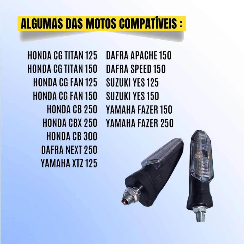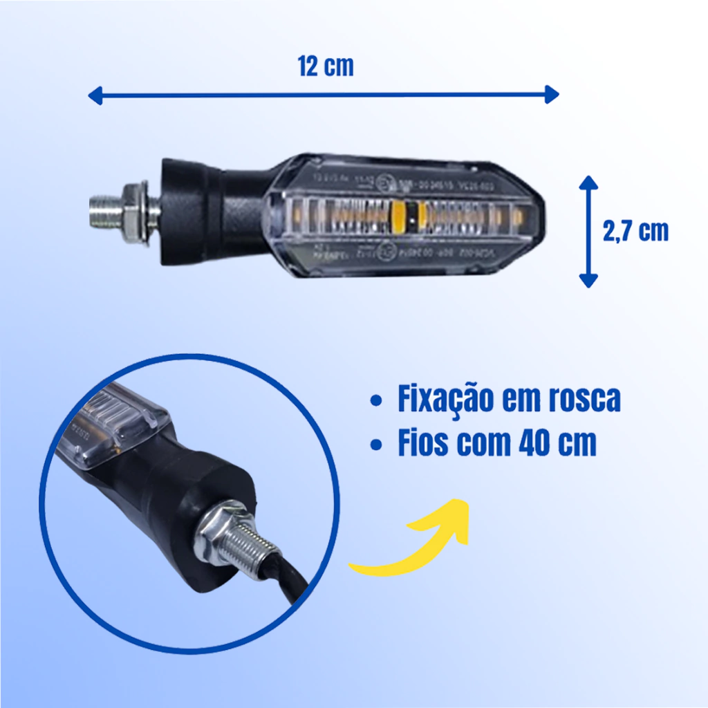 Fabricados com lente de acrílico transparente reforçado e estrutura rígida em plástico de alta resistência, esses piscas esportivos possuem encaixe universal em rosca 10mm, podendo ser instalados na dianteira ou traseira de praticamente qualquer moto. Com fios de 30cm e tensão de 12V, garantem desempenho seguro e confiável, sem complicações.