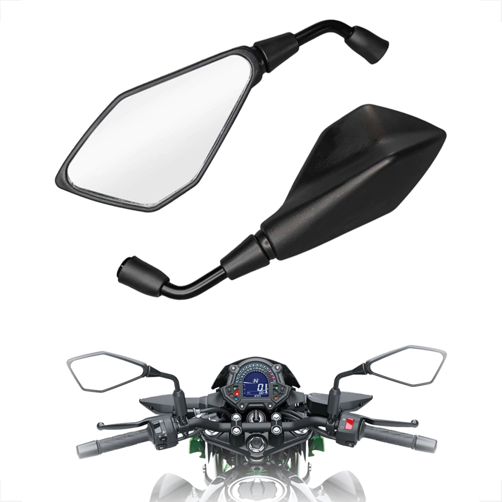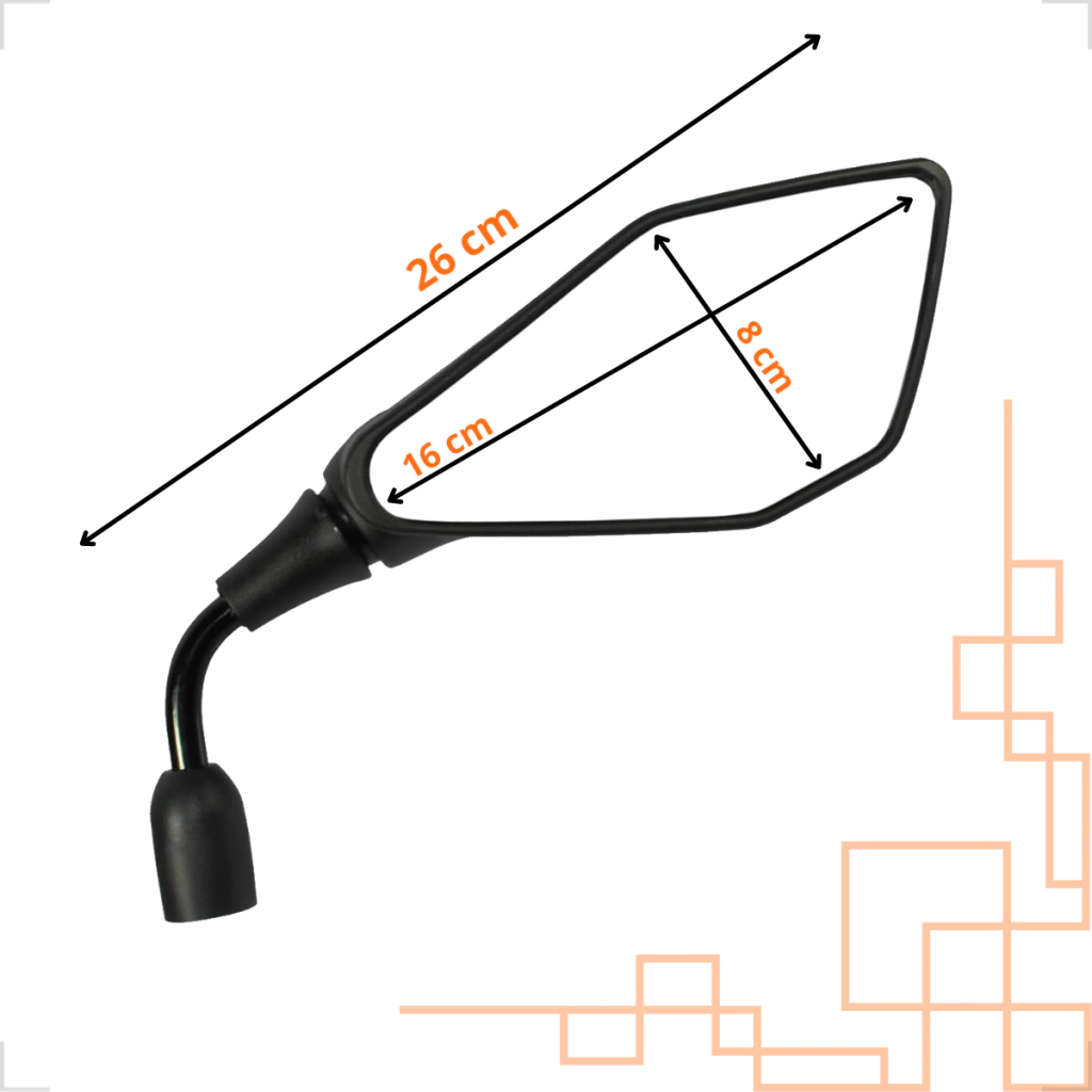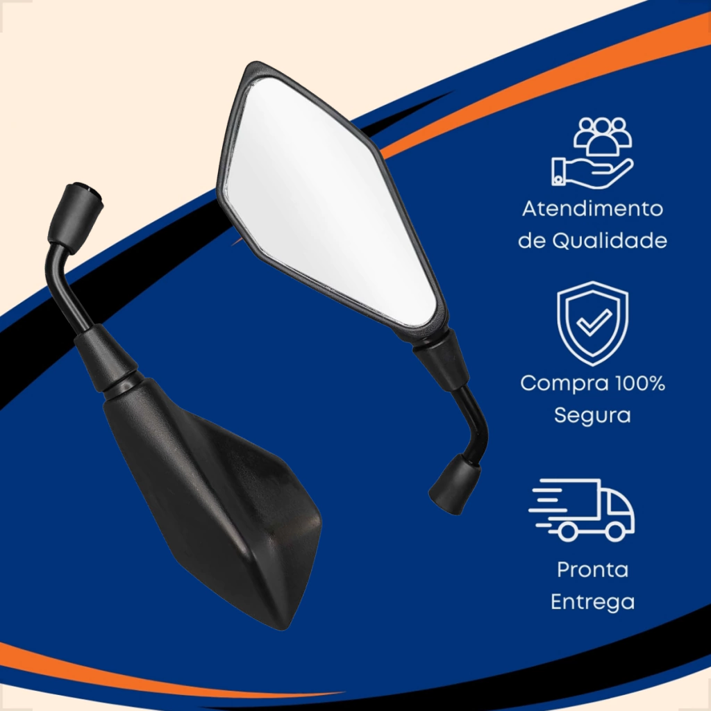 Fabricado em plástico ABS de alta resistência com haste em aço, este retrovisor combina durabilidade e estilo. Seu formato pentagonal e cor preto fosco trazem um visual sofisticado, enquanto a lente plana branca garante ótima visibilidade e segurança na pilotagem.